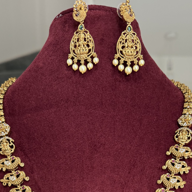 Inspired by South Indian heritage, this exquisite Nakshi Temple Jewellery Set features a traditional long haram necklace with matching earrings. Crafted with an antique gold finish, it showcases intricate temple motifs such as Goddess Lakshmi, peacocks, and mango designs. Embellished with classic Kemp stones, CZ accents, and elegant pearl or bead drops, this set offers a rich, regal look—perfect for weddings, festivals, and traditional occasions.